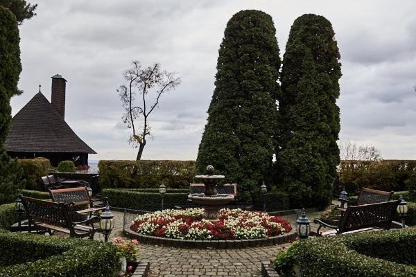 The entrance courtyard was refurbished in 2004. The upper terrace is parterre lined and filled with ornamental drawings of a sheared evergreen shrub with a centrally located modern fountain. Flowerbeds are filled with planting roses. The parterre lawn is maintained.